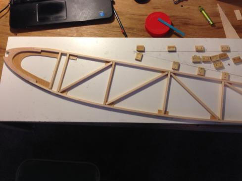 Construction time averages 2.5 hours per rib. As of today I have 15 ribs completed, and 3 more glued and gusseted on only one side. Total time on constructing the jig and ribs so far: 69.5 hours.